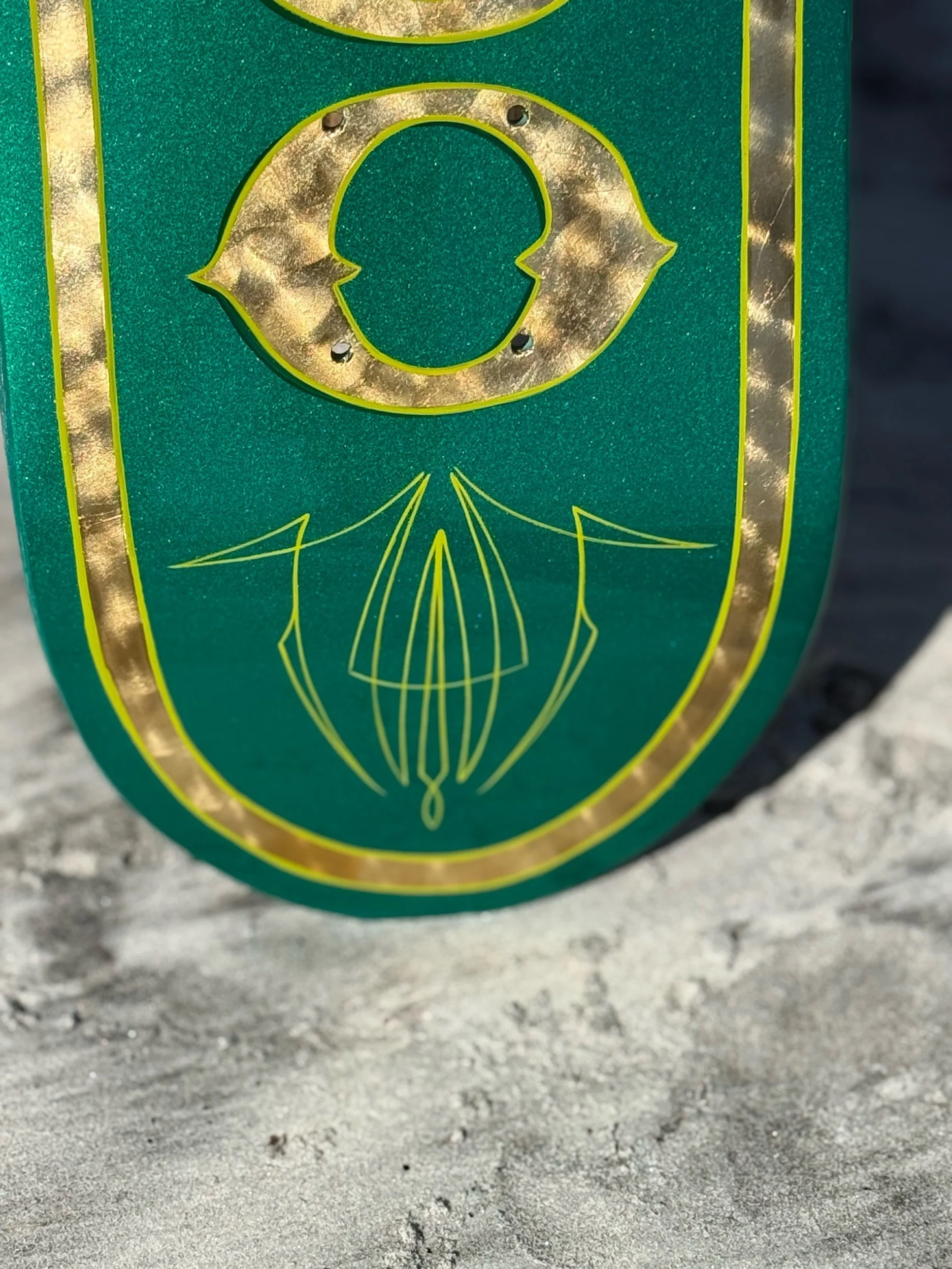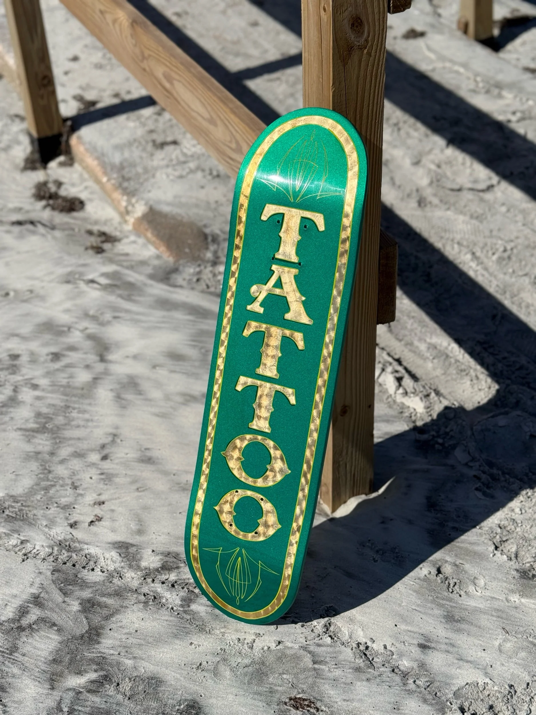 Gold leaf and pinstripes. Clean and simple with a sort of classic Las Vegas vibe. Perfect for any shop, game room, living room or wherever you wanna hang sick art! This comes as is but there’s specific skateboard hanging hardware available on Amazon for cheap